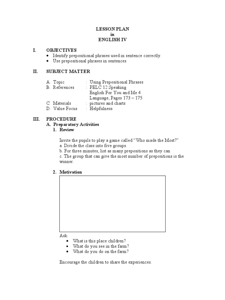 Lesson Plan In English Iv Pdf Preposition And Postposition Phrase