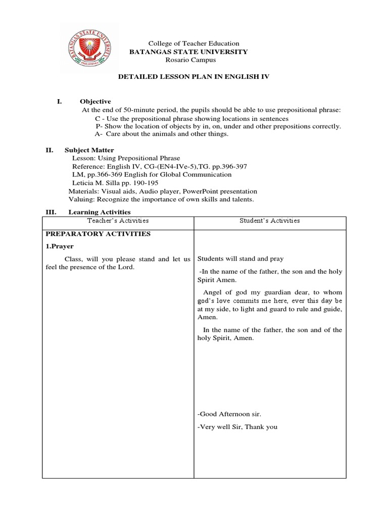 Detailed Lesson Plan In Preposition Grade 2